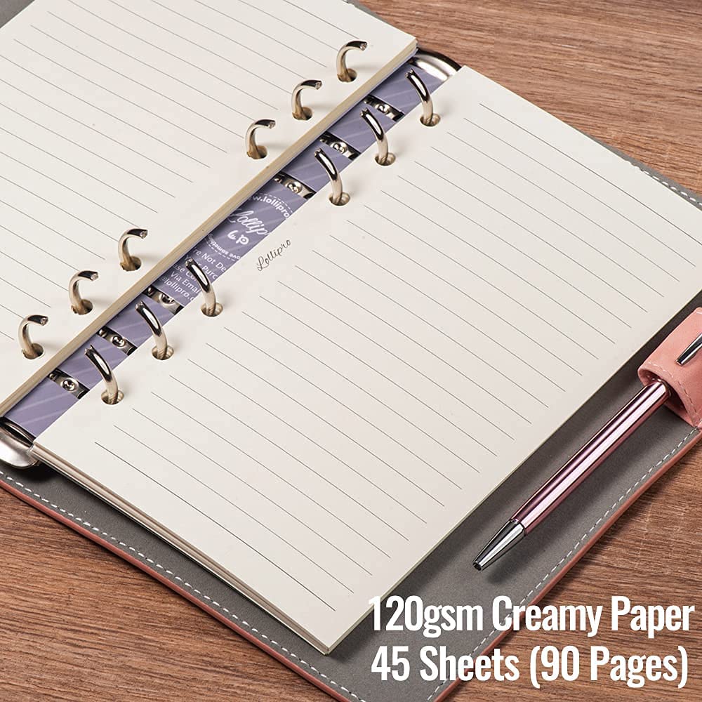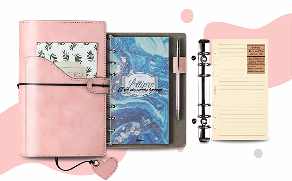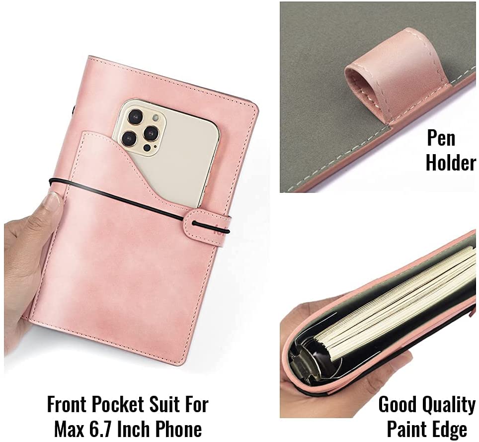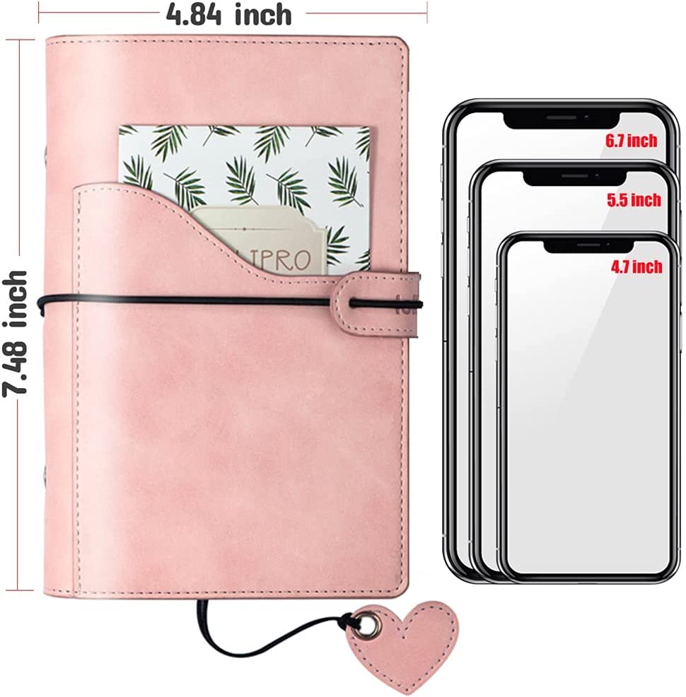 Soft-touch PU leather, Pocket in front design for tickets passport and max 6.7 inch phone. Light-weight and personal size suit for travel, inside can hold 80-100 sheets 6-hole filler paper, budget envelope or other insert pages as your like.