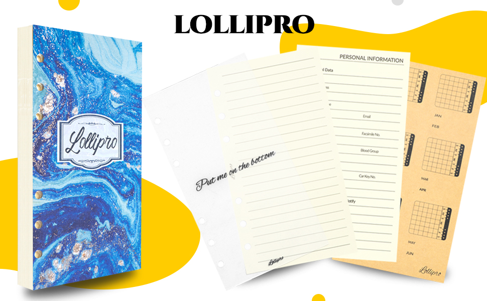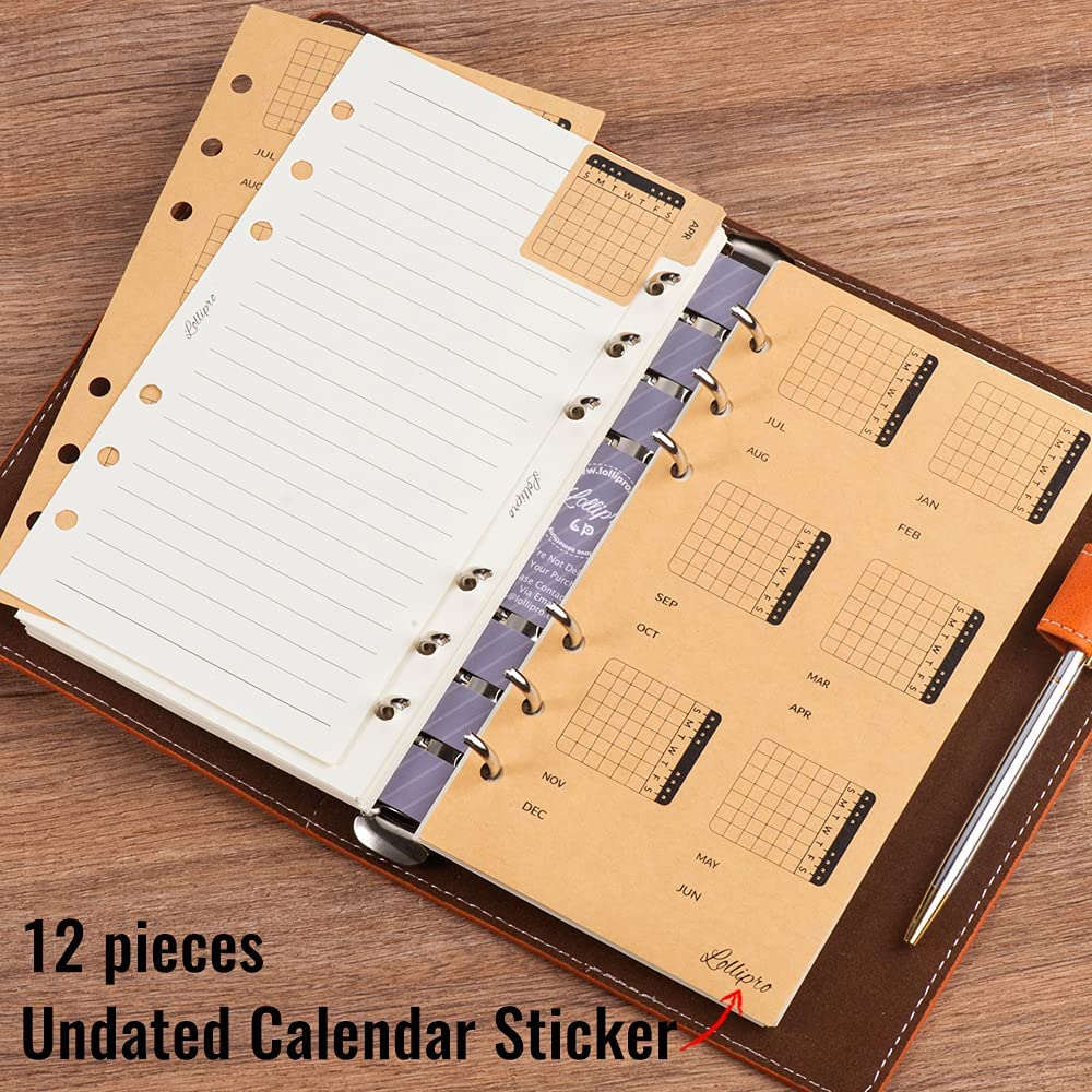 Product Name: Lollipro Lined Loose Leaf 120gsm Writing Paper For A6 Personal Size Binder Package Includes: 2 pack total 90 sheets (180 pages) writing paper, 1 × personal information page, 12 × Kraft undated calendar Index sticker and 1 ×plastic protector.