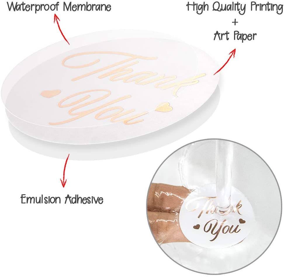 ---------------------Strong Adhesive: Perfect sealing to keep your stuff safely in envelope and box-----------------------------------------------------------------Water Resistant: Polymer coated surface bright and clean without dust--------------------------------------------------------------------------Use labels for anniversary, wedding, birthday gift, thank you envelopes. Add your thanks to special orders, gift boxes, bags and more.