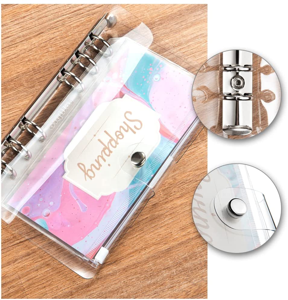 A6 Small 6 ring personal size portable 7.68 x 4.8 inch, convenient for travel home, office and school, easily fits in your handbag, backpack, suitcase or desk. Waterproof clear soft-touch PVC binder cover,can hold 80-100 sheets Paper or budget envelope or other insert pages as your like.
